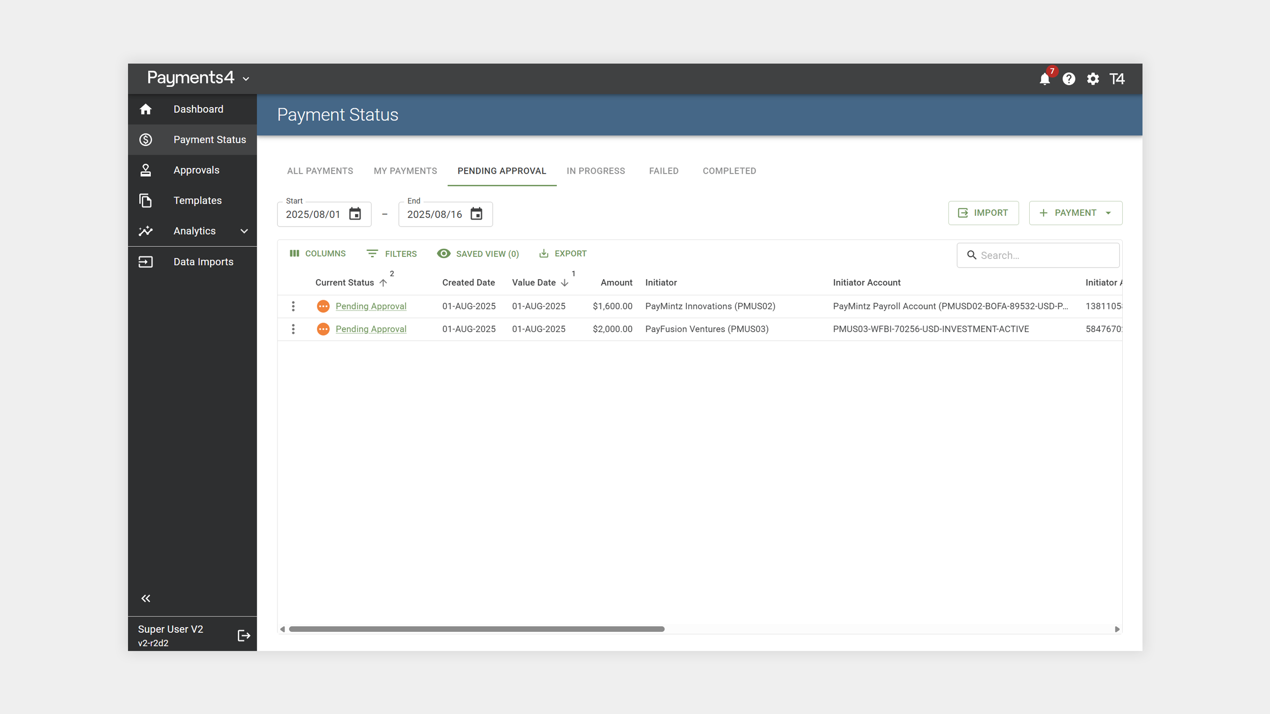 This project aimed to evolve our Treasury platform into a complete TMS by building a Payments module that met MVP requirements, supported customer objectives, and delivered modern yet familiar workflows with controls for templates, approvals, group management, and compliance.