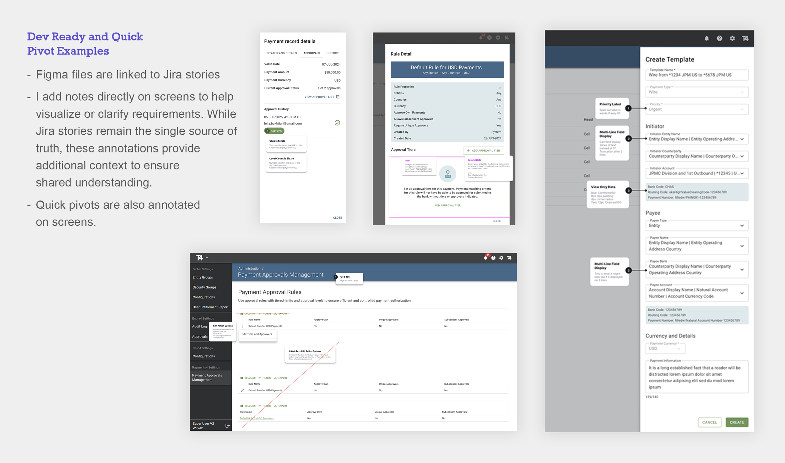 Designing a payments module means creating a complex network of workflows and administrative controls. It’s not just “send a payment”, it’s enabling templates for efficiency, supporting free-form payments for flexibility, enforcing approval rules based on tiered amounts, managing approval groups, and ensuring every step aligns with security and compliance requirements.